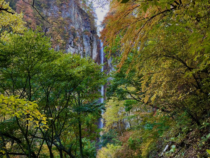 米子大瀑布は、落差85mの「不動滝」と75mの「権現滝」からなる二段構えの名瀑。轟音とともに流れ落ちる水は、四季折々の風景と調和し、訪れる人々に圧倒的な自然の力を感じさせます。特に新緑や紅葉の季節は、滝と森が織りなす色彩が幻想的です。