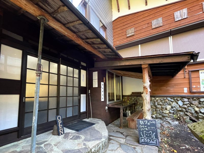 米子大瀑布の不動滝と権現滝の目前に佇む「根子岳山荘」は、自然と調和した小さな山小屋。