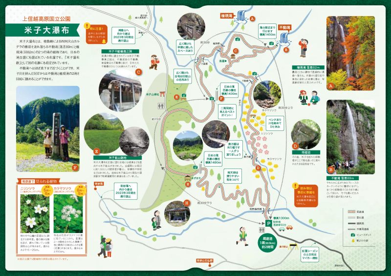 ルート:駐車場→米子不動尊奥の院→不動滝→権現滝→米子鉱山跡地(ビューポイント)→あずまや(ビューポイント)→駐車場