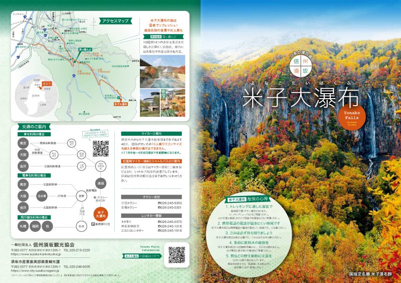 • 米子大瀑布駐車場まで 須坂市の中心市街地から車で約50分。須坂長野東インターチェンジから約50分。